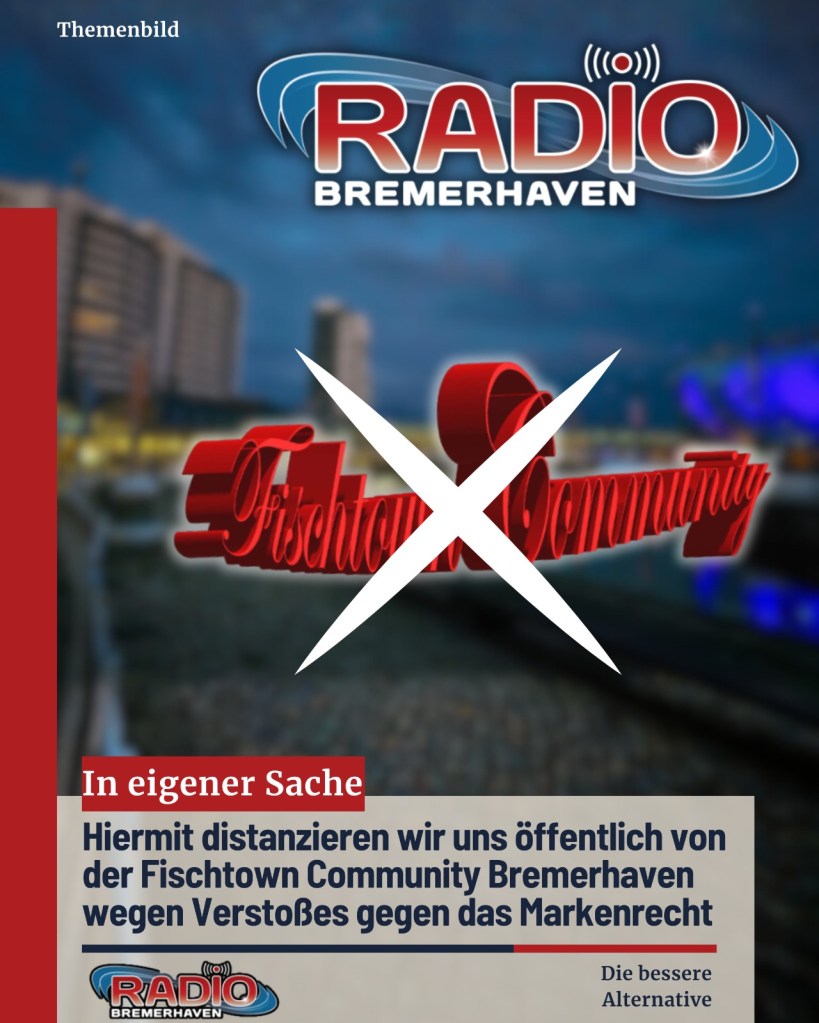 Hiermit geben wir öffentlich bekannt, dass wir uns ausdrücklich von der Fischtown Community Bremerhaven distanzieren! Radio Bremerhaven steht in keinerlei Bezug zu deren Seite!
