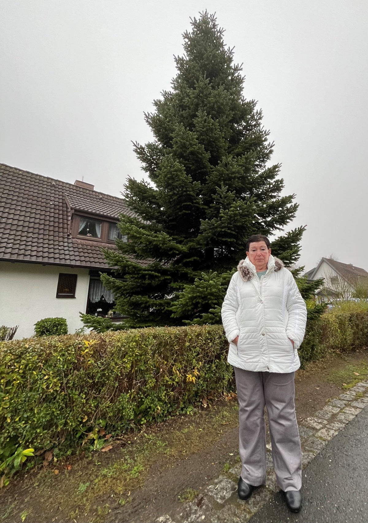 „Er ist einfach zu groß geworden“, sagt Traute Knitel, die mit einem lachenden und einem weinenden Auge Abschied nimmt. Einst hatte sie den Baum ihrer Tochter als kleinen Weihnachtsbaum im Topf geschenkt. Nach dem Fest kam er zu ihr zurück – „zum Aufpäppeln“, wie sie erzählt und lacht. „Hab ich gemacht – und wie man sieht, wohl zu gut!“ Jahrelang erfüllte er die Funktion des Weihnachtsbaumes vor dem Haus, aber irgendwann war auch die Leiter nicht mehr lang genug, um die Lichter in die Zweige zu hängen.