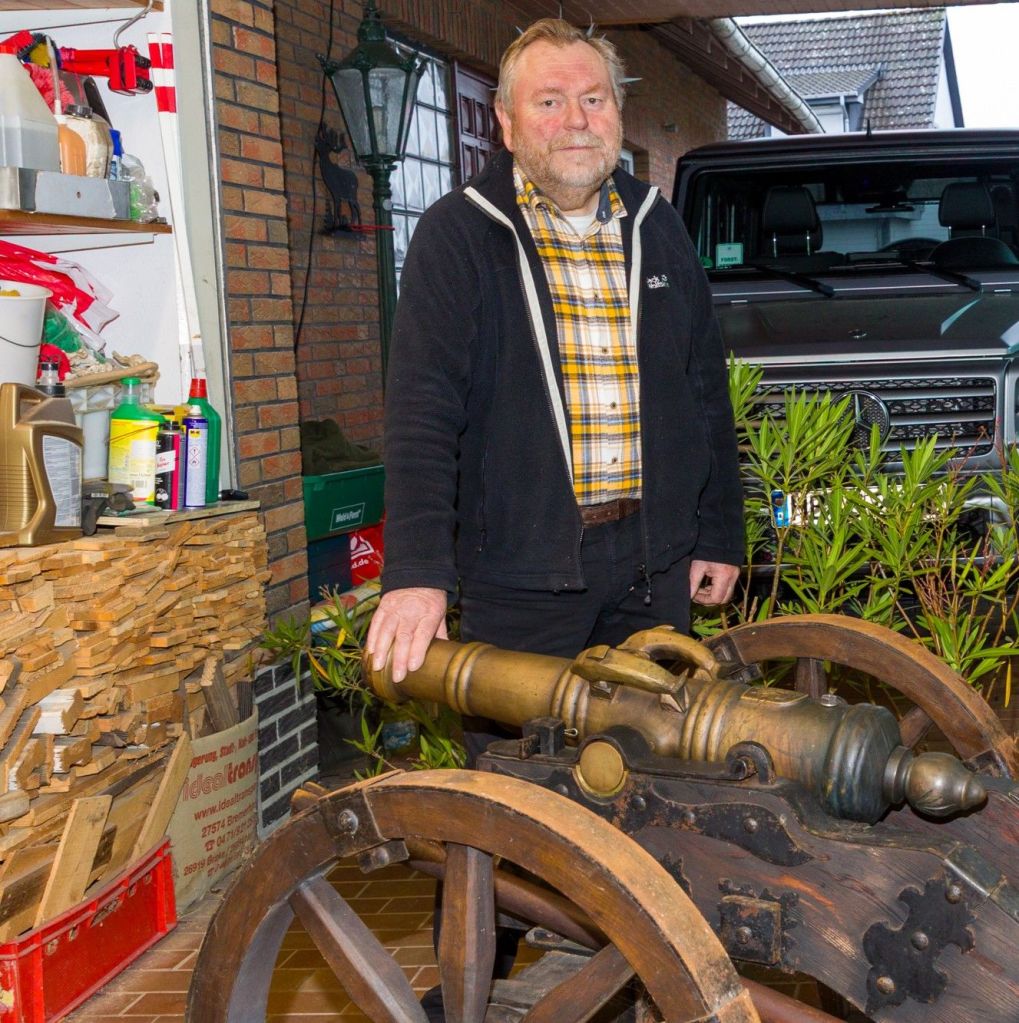 Die kleine Kanone von Hans-Georg Ennen, Kaliber 54 Millimeter und in einem Stück aus hochfester Bronze gegossen, ist eine Nachbildung aus dem 18. Jahrhundert. Allein das Rohr wiegt rund 75 Kilogramm und hat etwa 8.000 Euro gekostet. Die Kanone liegt auf einer Lafette nach preußischem Vorbild, mit Feldgeschützen wie diesen zogen Soldaten einst in den Krieg. Problemlos vier Kilometer weit fliegen würde eine Kanonenkugel, meint Ennen.