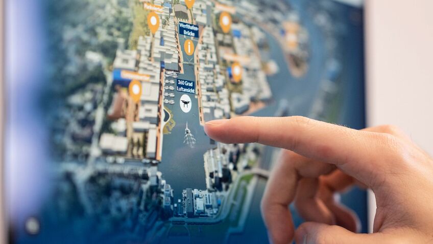 Ergänzt wird die 3D-Darstellung durch thematische Karten, etwa zu Verkehrsführung, öffentlichem Personennahverkehr und Radwegen. Eine Vorher-Nachher-Ansicht verdeutlicht zusätzlich den Wandel des Areals und macht die Vision des Werftquartiers transparent nachvollziehbar.