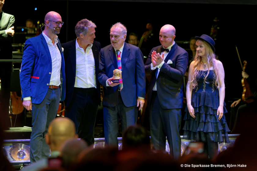 Im Rahmen der Filmfest-Gala am 19. März verlieh die Sparkasse Bremen in Kooperation mit dem Filmfest Bremen den Bremer Filmpreis 2025 an den preisgekrönten britischen Regisseur Stephen Frears für sein filmisches Gesamtwerk. Überreicht wurde die mit 8.000 Euro dotierte Auszeichnung von Klaus Windheuser, Vorstandsmitglied der Sparkasse Bremen, und Matthias Greving, Festivalleiter des Filmfests, im großen Saal des Theaters am Goetheplatz. Die Laudatio hielt kein geringerer als Hugh Grant, mit dem Frears sowohl in der TV Serie „A Very British Scandal“ als auch in „Florence Foster Jenkins“ zusammengearbeitet hat: “I know three German words – and they are beautiful words: Kartoffel, Strumpfhose, Hähnchen. Genauso wunderschön wie diese Worte ist auch Stephen Frears. Oder zumindest genauso einzigartig. Ich bin nicht hier, um Ihnen zu sagen, dass er ein großartiger Regisseur ist. Denn das wissen Sie bereits. Wichtiger ist: Er ist ein sehr, sehr ungewöhnlicher Mensch. Manche nennen ihn „exzentrisch“, andere „seltsam“. Ich nenne ihn einen raving lunatic… Am Set ist er zugleich furchteinflößend und fürsorglich. Er baut einen auf – nur um Sekunden später mit einem trockenen Kommentar alles einzureißen. Man muss ihn lieben, aber vorsichtig. Unsere Freundschaft? Ein ständiger Schlagabtausch aus Ironie, Beleidigungen in höflichem Tonfall und kreativen Chaos. Und genau deshalb bin ich hier: Um Stephen Frears zu feiern – den Wahnsinnigen, den Geschichtenerzähler, den Freund.“ Nachdem er sich für diese Ehrung bedankte, wunderte er sich zunächst darüber, dass die Deutschen offenbar eine Vorliebe dafür haben, ihre Trophäen in Tierform zu vergeben: „Was habt ihr nur immer mit den Tieren? In Berlin bekomme ich Bären, in Bremen einen Hund …“ Und zum Abschluss richtete Frears eine Botschaft an alle jungen Filmemacher im Saal: „Haltet das europäische Kino am Leben. Seid der Selenskyj des Films!“